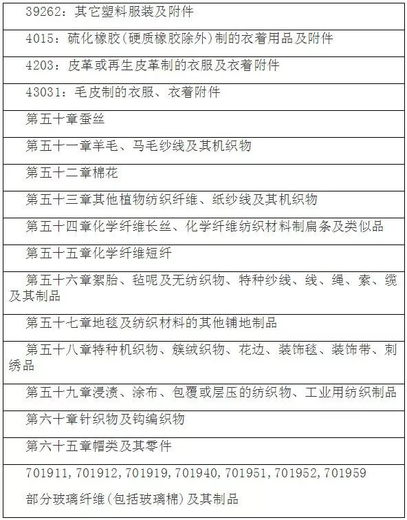 此次美方的建議征稅清單涵蓋6031個稅號,其中紡織服裝產(chǎn)品稅號達1000余個,涉及絕大部分紡織原料、半成品以及少量服裝附件產(chǎn)品,主要包括紡織原料(棉花、絲、毛、麻等);紗線和面料(棉、毛、絲、麻、化纖、玻璃纖維等制);地毯;工業(yè)用紡織品;皮革和毛皮服裝、帽類及手套、塑料雨衣等。中國對美出口額較大的梭織服裝、針織服裝和家用紡織制成品等商品未列入清單。 涉及產(chǎn)品包括(僅指紡織服裝統(tǒng)計項下產(chǎn)品):